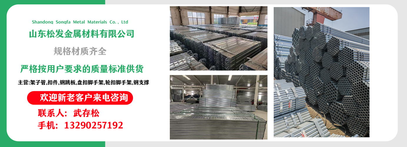 山東松發(fā)金屬材料有限公司主營(yíng)架子管,扣件,鋼跳板,盤扣腳手架,輪扣腳手架,鋼支撐生產(chǎn)廠家。本廠專業(yè)生產(chǎn)銷售。 建筑用架子管、 主要用于房建,橋梁,鐵路,公路,地鐵,水庫(kù),隧道,支撐。 架子管,扣件,鋼跳板,盤扣腳手架,輪扣腳手架,鋼支撐的優(yōu)越性及應(yīng)用“ ”產(chǎn)品因具有結(jié)構(gòu)簡(jiǎn)單合理、設(shè)計(jì)巧妙、使用方便、安全、快捷、易于運(yùn)輸、儲(chǔ)存、維護(hù)簡(jiǎn)單等特點(diǎn)。 公司一貫堅(jiān)持“質(zhì)量,用戶至上,優(yōu)質(zhì)服務(wù),信守合同”的宗旨,憑借著高質(zhì)量的產(chǎn)品,良好的信譽(yù),優(yōu)質(zhì)的服務(wù),產(chǎn)品暢銷全球。歡迎廣大客戶來電洽談,共同發(fā)展,共創(chuàng)輝煌! 山東松發(fā)金屬材料有限公司秉承誠(chéng)信服務(wù)、恪守信譽(yù)的宗旨,在同等的質(zhì)量下,保證以最低的價(jià)格,最完善的服務(wù),最高的信譽(yù)來答謝各界朋友的支持和厚愛,歡迎您的來電、咨詢,我們將竭誠(chéng)為您服務(wù)!...